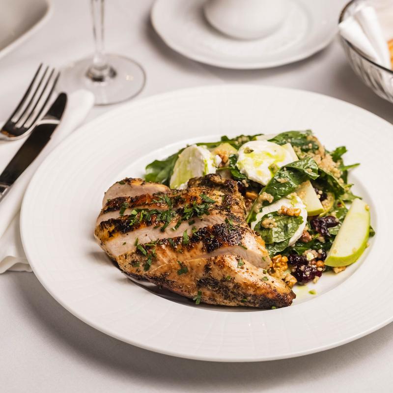 Grilled chicken, baby kale, goat cheese, quinoa, apple, dried cranberries, toasted walnuts, pomegranate vinaigrette.