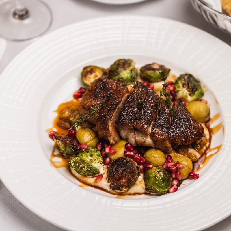 Pan-roasted breast, cauliflower puree, Brussel sprouts, chestnuts, golden raisins, pomegranates.